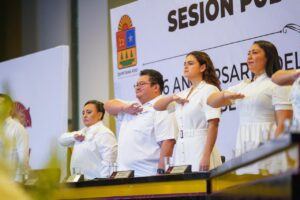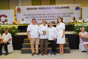 En la sesión pública y solemne del 176 aniversario del decreto de la creación del pueblo de San Miguel de Cozumel, realizada en el Centro de Convenciones, el presidente municipal José Luis Chacón Méndez, junto con el honorable Cabildo de Cozumel, encabezó la ceremonia acompañado por las personas representantes de los titulares de los poderes del Gobierno del Estado: María Cristina Torres Gómez, secretaria de Gobierno del Estado en representación de la gobernadora constitucional de Quintana Roo, Mara Lezama Espinosa, y la diputada Alexa Murguía Trujillo, presidenta de la Comisión de Educación, Ciencia y Tecnología de la Honorable XVIII Legislatura del Congreso del Estado de Quintana Roo.