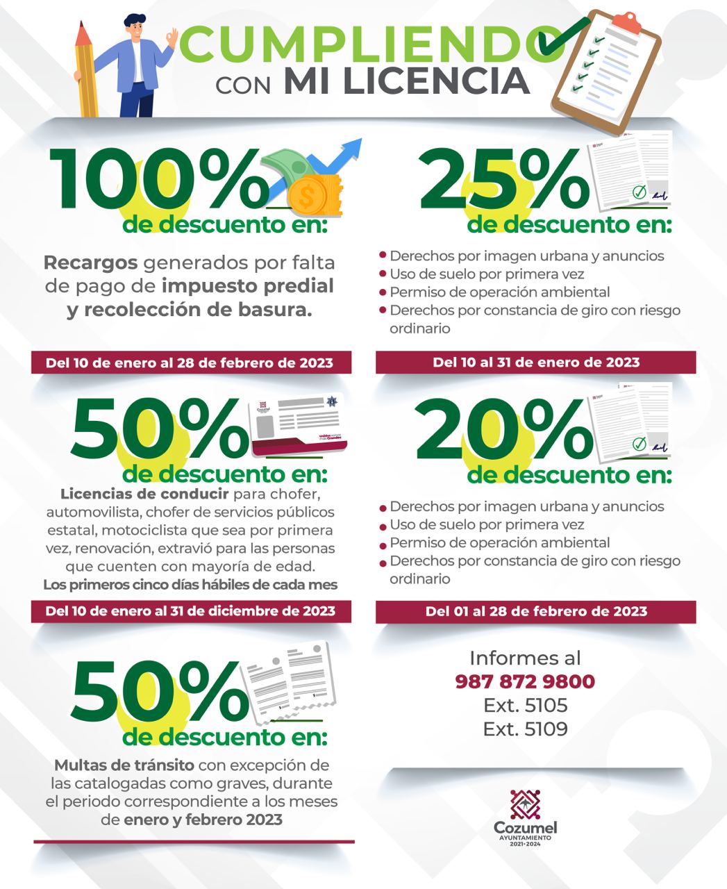 Quedan pocos días para que la ciudadanía pueda obtener el 10 por ciento de descuento en el pago anticipado del impuesto predial del ejercicio fiscal 2023 y para el pago de recolección de desechos (basura), del programa de recaudación “Ahorra es cuando”, así como también de los incentivos que se ofrecen en “Cumpliendo con mi licencia” los cuales tienen vigencia hasta el 28 de febrero.